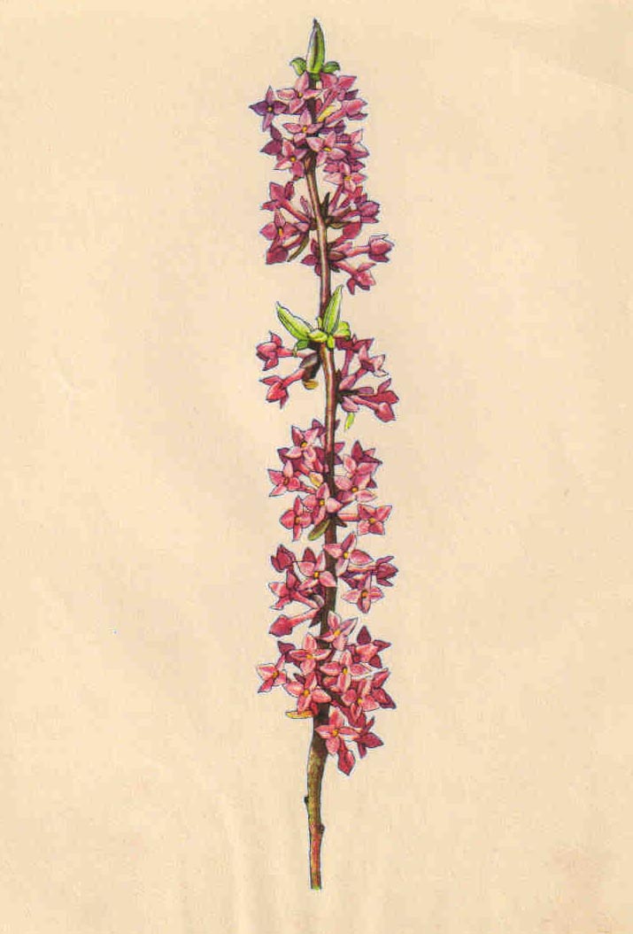 Je to menší keř, 30 - 150 cm vysoký, s větvemi většinou dosti řídkými, pevnými a houževnatými, jež jsou v mládí plstnaté a později olysávají. Listy jsou střídavé, na konci větví nahloučené, podlouhlé až tupě špičaté, s krátkými řapíky, lysé, naspodu bledší. Drobné růžové nebo růžově fialové (zřídka bílé) kvítky, jež tvarem i zbarvením trochu připomínají květy šeříku, jsou nahloučeny v chudých postranních svazečcích na hořejších částech větví. Krásně voní, jsou přisedlé a 5 - 10 mm dlouhé. Jejich okvětí (korunovitě zbarvený kalich, neboť vlastní koruna není vyvinuta) je tvořeno dlouhou trubkou, která na konci nese 4 ploše rozložené cípy. Osm tyčinek přirůstá krátkými nitkami k trubce okvětí ve dvou kruzích, a to tak, že 4 jsou blíže ústí a 4 o něco níže. Svrchní semeník, tvořený jedním plodolistem, se za plodu mění ve šťavnatou, ohnivě červenou peckovici. Kvete v únoru až březnu, je-li mírná zima často i v prosinci nebo v lednu, je-li zima tuhá, až v dubnu. Celá rostlina je prudce jedovatá.